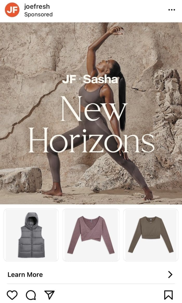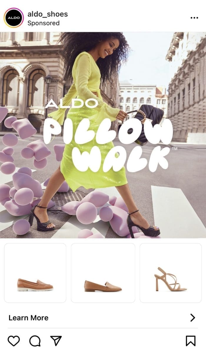 Similar to stories, collection ads are an immersive format enticing users towards a realm of visual mobile shopping. It combines some of the aforementioned creatives such as a captivating cover photo or video with a slideshow of selected physical products.