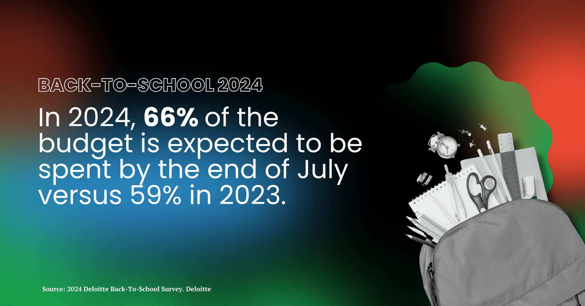 Shopping for back-to-school items typically begins well in advance, often as early as July and continues until Labour Day. In 2024, 66% of the budget is expected to be spent by the end of July, compared to 59% in 2023.