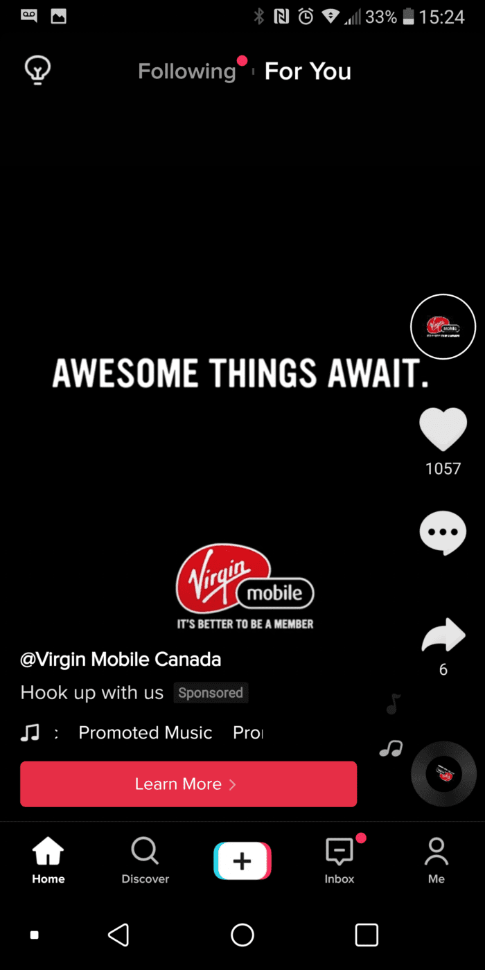 TikTok’s In-Feed Videos Ads looks similar to in-feed ads found on other social media platforms. This Tiktok advertisement is a clickable 5-30 seconds long full-screen vertical video experience. This more common advertising placement is great at generating brand awareness and increasing traffic to a website.