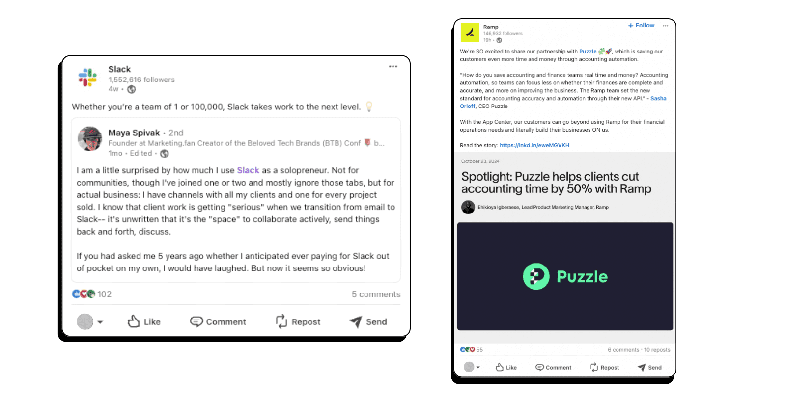 Regardez comment Slack a simplement repartagé un post organique d’un utilisateur satisfait, ça veut tout dire. De leur côté, Ramp partage un lien vers une étude de cas sur leur site Web et met en lumière un de leur client, c’est également une bonne façon de faire!