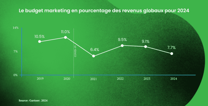 Les départements marketing doivent générer de bons résultats avec moins de ressources cette année. En 2024, les budgets marketing ont été considérablement réduits. Le budget moyen est passé de 9,1 % des revenus de l’entreprise en 2023 à 7,7 % en 2024, selon Gartner.