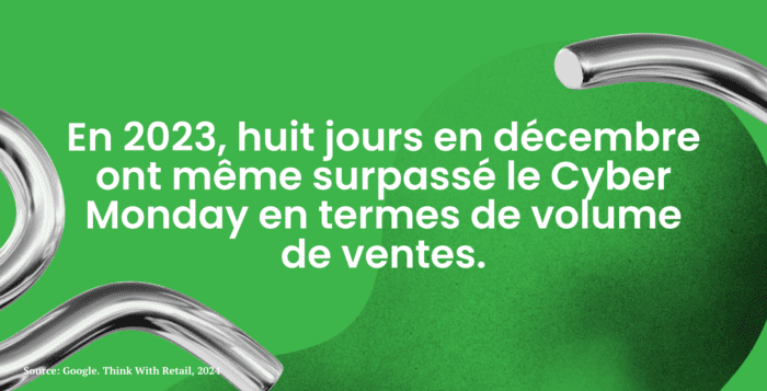 En 2023, huit jours en décembre ont même surpassé le Cyber Monday en termes de volume de ventes. Plus de deux tiers des acheteurs savent déjà quels cadeaux offrir dès le début du mois. C’est pourquoi il est crucial de rester visible et présent pendant les jours les plus achalandés de décembre.